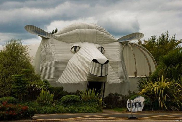 Оказавшись в Новой Зеландии в городе Тирау, можно увидеть очень необычное здание, фасад которого выглядит, как огромная овца. Все это здание – один большой магазин, который занимается продажей шерсти и шерстяных изделий. Стоит знать, что Новая Зеландия очень гордится своим шерстяным производством. Эта отрасль является одной из визитных карточек страны и занимает важное место в ее экономике.
