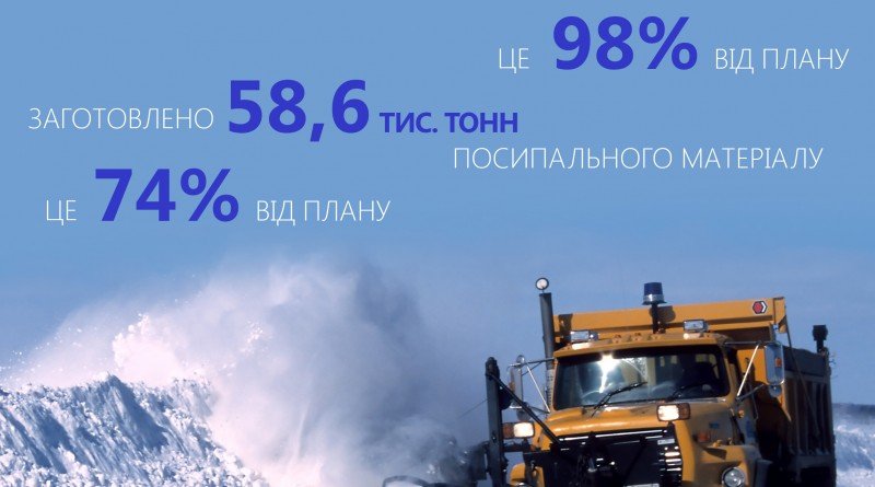 Заготовлено 58,6 тис. тонн посипального матеріалу. Це 74% від плану. Крім того з підприємствами регіону існує домовленість про виділення додаткової техніки та паливно-мастильних матеріалів у разі виникнення надзвичайної ситуації.
