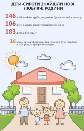 У 2015 році на Дніпропетровщині було створено 16 нових дитячих будинків сімейного типу. У них знайшли батьківську любов та турботу 146 дітей. З’явилися нові члени родини й у 48 прийомних сім’ях. Вони взяли на виховання 106 хлопців та дівчат. Ще 183 дитини-сироти усиновили нові папа та мама.