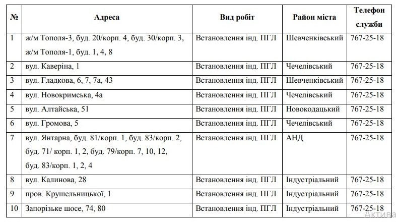 “Дніпрогаз” інформує жителів міста про графіки виконання робіт на внутрішньобудинкових системах газопостачання та встановлення лічильників газу. Під час цих робіт газопостачання у домоволодіннях може бути тимчасово призупинено. За інформацією прес-службі газу не буде з 22 липня по 2 серпня.