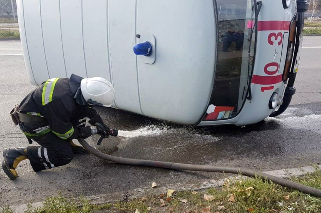 Рятувальники встановлено, що перетинаючи перехрестя, водій автомобілю швидкої медичної допомоги був вимушений різко загальмувати, від чого транспортний засіб перекинувся на бік.