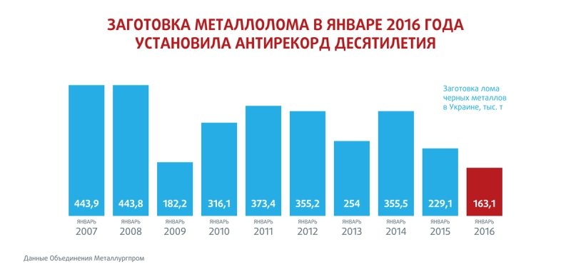 Заготовка металлолома в январе установила антирекорд. В первом месяце 2016 года было собрано 163 тыс. т сырья. Это самый низкий объем заготовки металлургического сырья, по меньшей мере, за десятилетие. Внутреннее потребление составило 161,5 тыс. т по данным Металлургпрома, экспорт – 1,5 тыс. т. по данным ГФС.