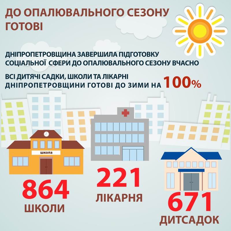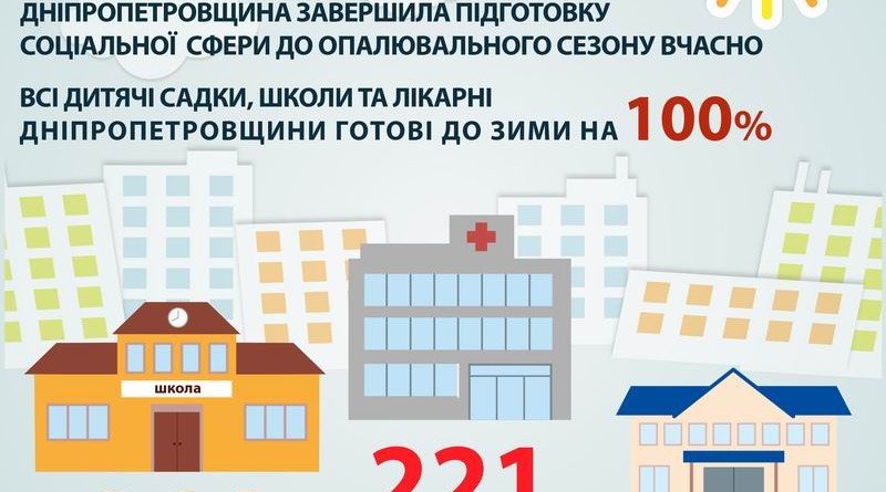 Дніпропетровщина завершила підготовку соціальної сфери до опалювального сезону вчасно. Всі дитячі садки, школи та лікарні Дніпропетровщині готові до зими на 100%. Про це заявив очільник області Валентин Резніченко.