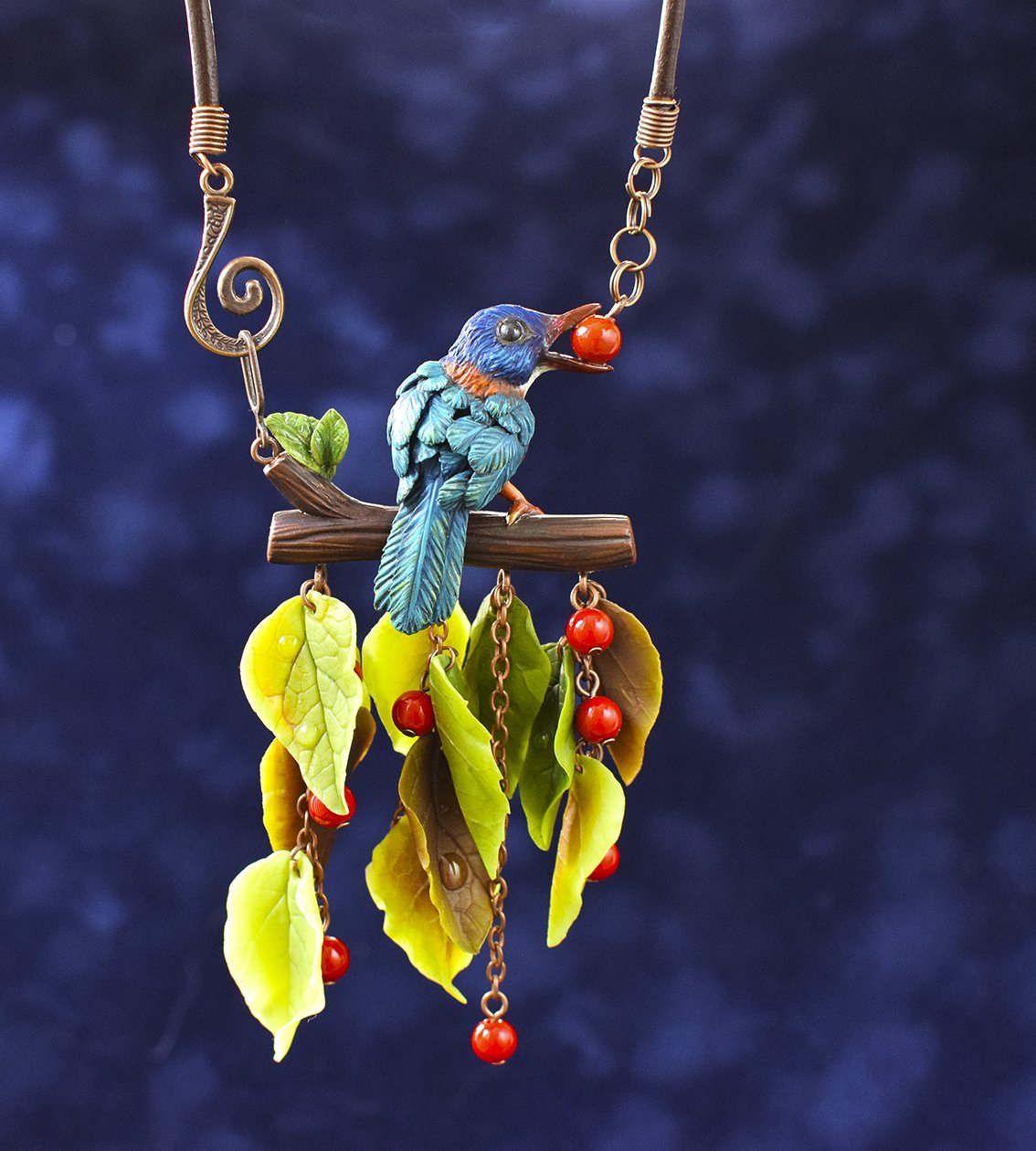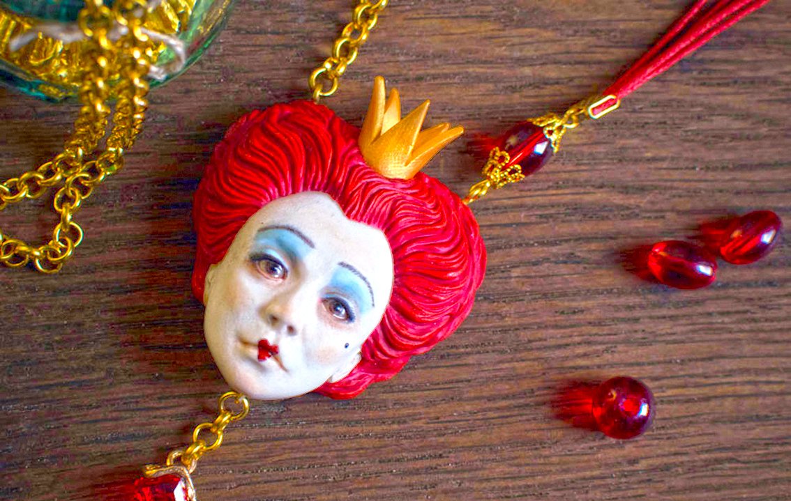 Первое время я делала в основном украшения. Мне это нравится и сейчас, но слишком большая конкуренция. Кстати, я не люблю делать украшения в стиле «гламур». Нравится что-нибудь необычное и креативное: браслеты или подвески с героями из мультиков и фильмов, зверюшками, ягодами… Есть,  например, птичка Зимородок, которая «сидит» на ветке с листочками и клювом ухватилась за красную ягоду. Еще из любимых работ – подвеска с лисом и кулон с королевой из фильма «Алиса в Стране чудес».