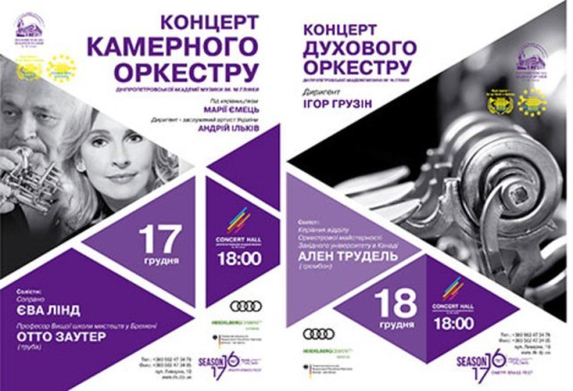 17 грудня о 18-00 відбудеться концерт Камерного оркестру Академії музики ім. М. Глінки під керівництвом Марії Ємець. Диригент: заслужений артист України Андрій Ільків. Солісти: Єва Лінд (сопрано), Отто Заутер (труба).