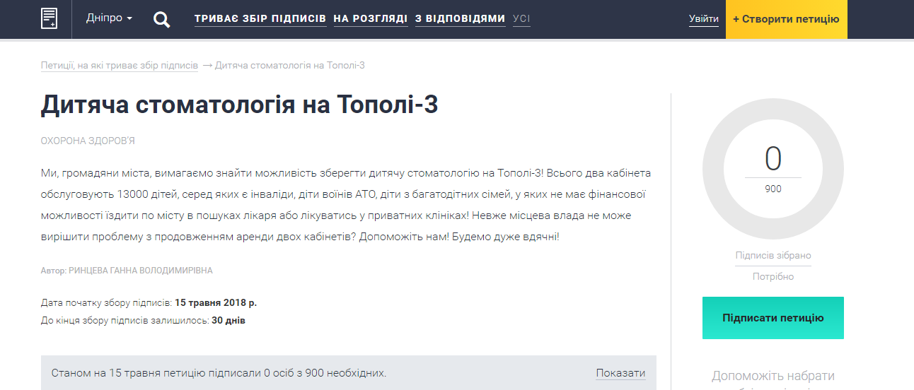 «Ми, громадяни міста, вимагаємо знайти можливість зберегти дитячу стоматологію на Тополі-3! Всього два кабінети обслуговують 13000 дітей, серед яких є інваліди, діти воїнів АТО, діти з багатодітних сімей, у яких не має фінансової можливості їздити по місту в пошуках лікаря або лікуватись у приватних клініках! Невже місцева влада не може вирішити проблему з продовженням аренди двох кабінетів?», – написала автор петиції Ганна Ринцева.