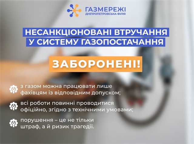 Дніпропетровська філія газорозподільної компанії «Газмережі» закликає споживачів не проводити самостійних підключень до газорозподільної системи. Такі дії є не лише порушенням законодавства, а й прямою загрозою життю та безпеці людей.