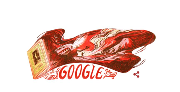 На дудле изображен астронавт на вездеходе, а сама картинка выполнена в багровых тонах в соответствии с названием книги.