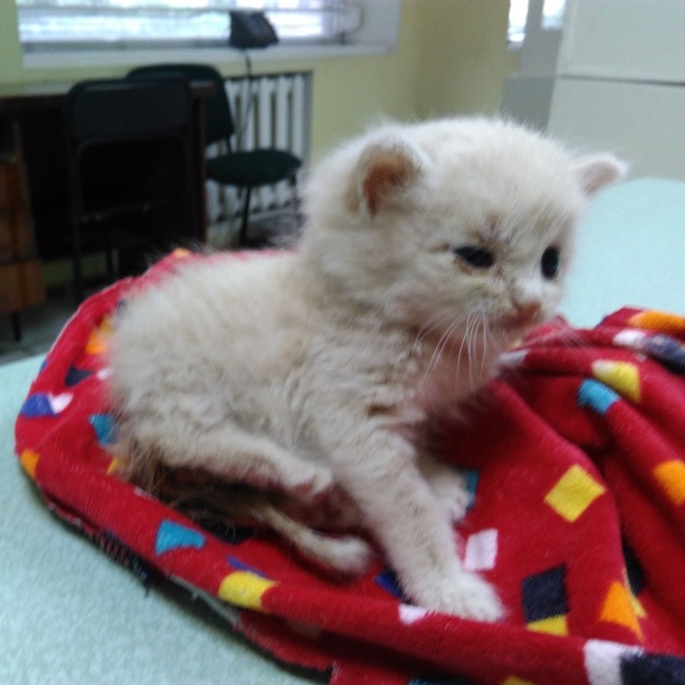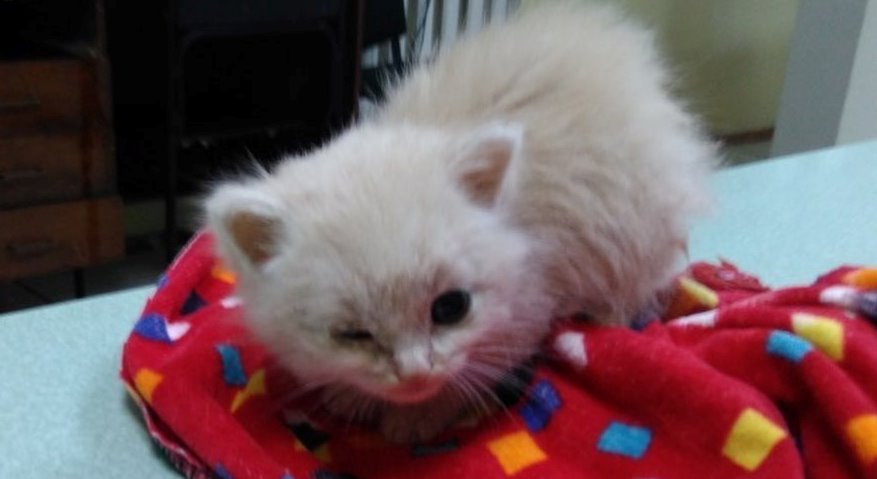 У клініці одразу ж побачили, що кошеня потребує допомоги – крихітне, близько трьох тижнів від народження, виснажене, з хворим оком, не здатне їсти самостійно і зі страшенною діареєю.