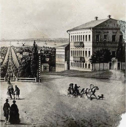 Данный участок возник в 1830-х годах после ликвидации Ярмарочной площади, которая располагалась у перекрестка Проспекта с современной улицей Владимира Вернадского (до недавнего времени ул. Дзержинского). Но серьёзные строения появились здесь только в середине XIX века, после создания Фабровских бульваров. Незадолго до начала Крымской войны, местный купец и строительный подрядчик А. Остроухов построил на своём участке три новых каменных дома (два по линии Екатерининского проспекта и один в глубине участка), благодаря которым домовладение сразу вошло в число крупнейших в городе.