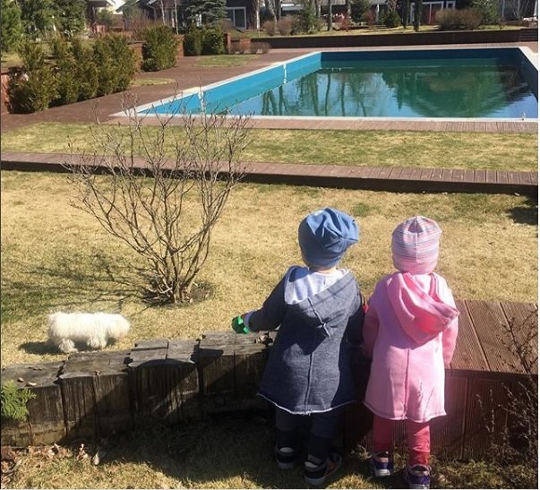 Как известно, 15 августа 2016 года в семье Елены и продюсера «ShootGroup Production» Сергея родились двойняшки – сын Иван и дочь Екатерина. На фото малыши наблюдают за гуляющим песиком на фоне живописного бассейна.