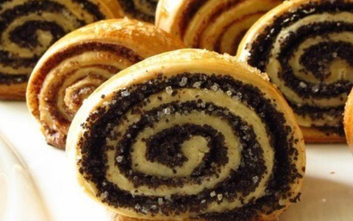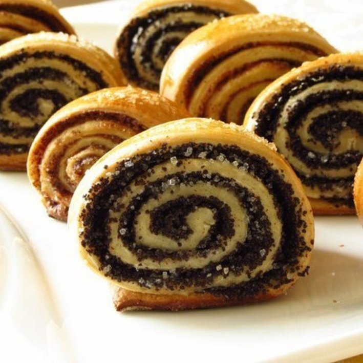 Способ приготовления: Мак запарить на 5 минут кипятком, потом слить воду, добавить сахар и дать остыть. Дрожжи разбавить в теплой воде (добавляя ложку сахара и муки). Через 15 минут соединить с 2,5 стакана муки, вымесить и поставить в теплое место на час. После того как тесто подошло, разделить его на 2 части. Каждую раскатать прямоугольником, смазать с одной стороны начинкой, свернуть в рулет. Рулет нарезать кусочками толщиной в 2-2,5 см. Плюшки выложить на противень, выстланный пекарской бумагой.Выпекать при температуре 180 0С около 20 минут.