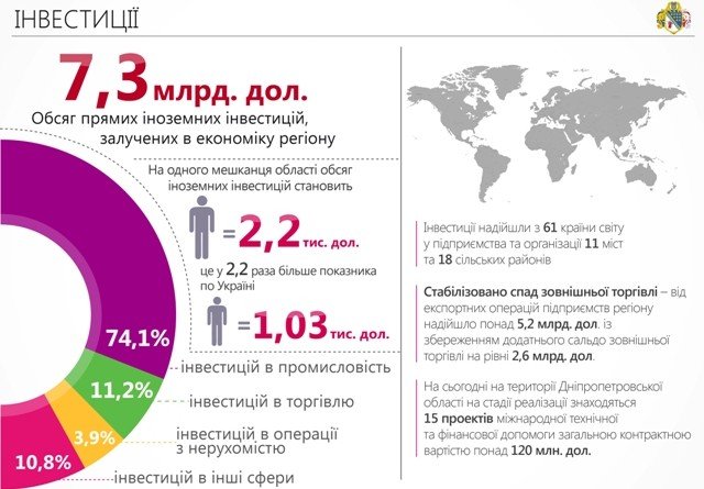 У Дніпропетровщину гроші вкладають понад 60 країн світу. На сьогодні в економіку регіону інвестовано майже 7,3 млрд. дол. США. Наш регіон займає перше місце за сумою інвестицій на одну людину – 2,2 тис. доларів. Це кращий результат серед областей. Показник Київської області, яка стоїть в рейтингу наступною, удвічі менше – всього 966 доларів на жителя. Поряд з іноземними партнерами у регіон вкладають і українські інвестори.
