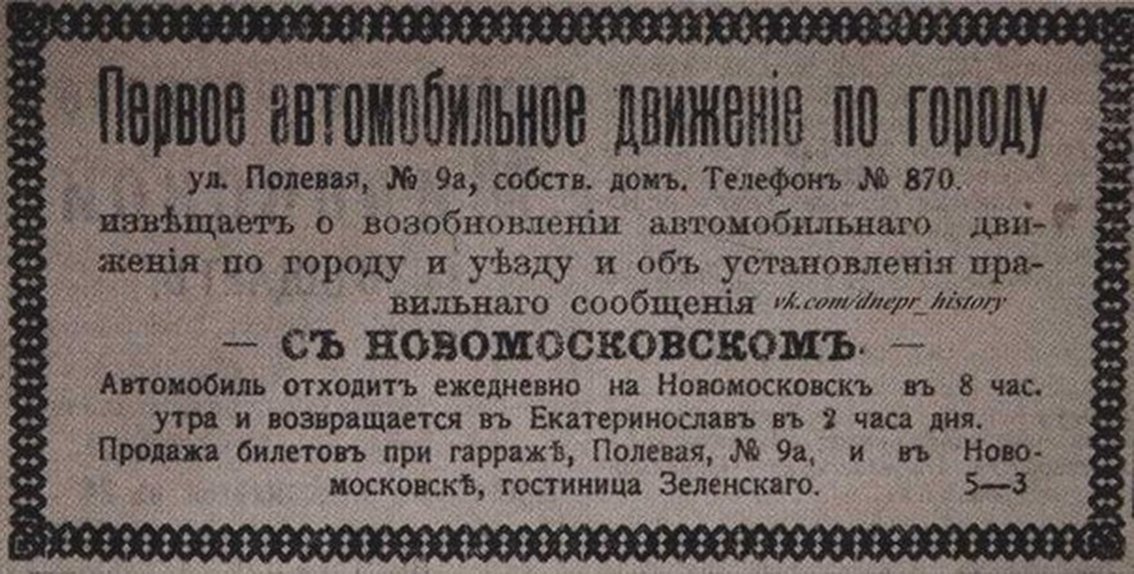 Время шло, и «в подкрепление» к трамваю в Екатеринославе в начале ХХ века появились первые автомобили. Их счастливыми обладателями стали самые известные и богатые семьи города – Родзянко, Толстиковых, Кузьмицких, Миклашевских, Каттавоза, Камбье. Свои «колеса» они использовали для передвижения и спортивных занятий. В феврале 1908 года по инициативе одного из уважаемых горожан, дворянина Андрея Миклашевского, открыли автосообщение между Екатеринославом и Новомосковском. В качестве «маршрутки» использовали омнибус вместимостью 9 человек. Билет стоил 1 рубль 25 копеек и обеспечивал доставку в одну сторону за 55 минут. Рейсы были ежедневными: из Екатеринослава омнибус отправлялся в 8 утра и возвращался в 2 часа того же дня. Автобусную станцию Миклашевский разместил в собственном дворе, пополнив «автопарк» 20-местной машиной. Летом этого же года к перевозкам присоединились еще три владельца автомобилей.