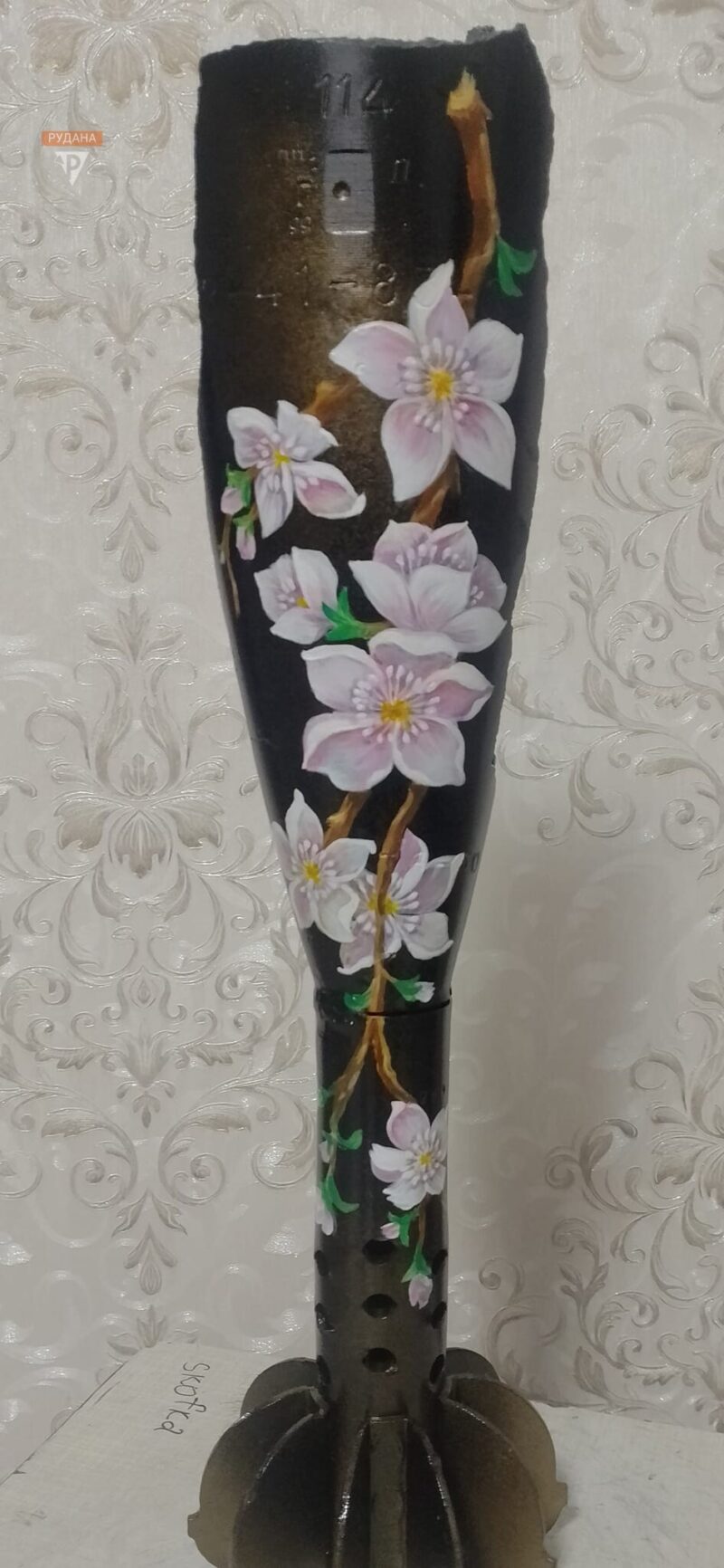 «Не потрібна нам така згадка», – відповіла Ірина. Довго дивилася на тубус, і їй закортіло змінити його так, щоб наповнити іншим сенсом. Вирішила намалювати на тубусі янгола, який захищав би наших дітей від ворога. Залишки зброї, яка є символом кривавої війни, криворожанка перетворила на можливість розповідати про війну та допомагати нашим воїнам”, – розповіла про художницю Світлана Климовська.