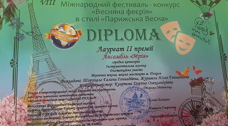 Щороку учні мистецьких шкіл Покрова Дніпропетровської області беруть участь у Міжнародному конкурсі «Весняна феєрія» в стилі “Парижська Весна”, що проводить фестивальний проект «Зірки ХХІ сторіччя». 2020 рік – не став винятком, проте карантин вніс свої корективи. Повідомляють у прес-службі міської ради.