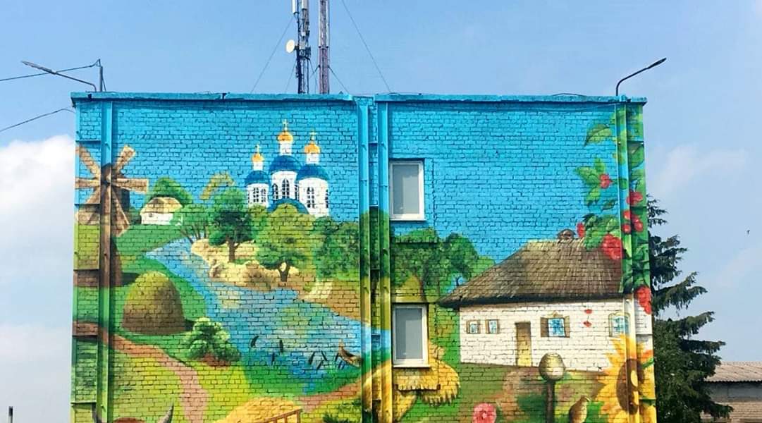 Мурал выполнен в украинском стиле: на нем мастера изобразили хату, церковь, мельницу и традиционный пейзаж. Украсил этот огромный рисунок здание одного из городских предприятий.