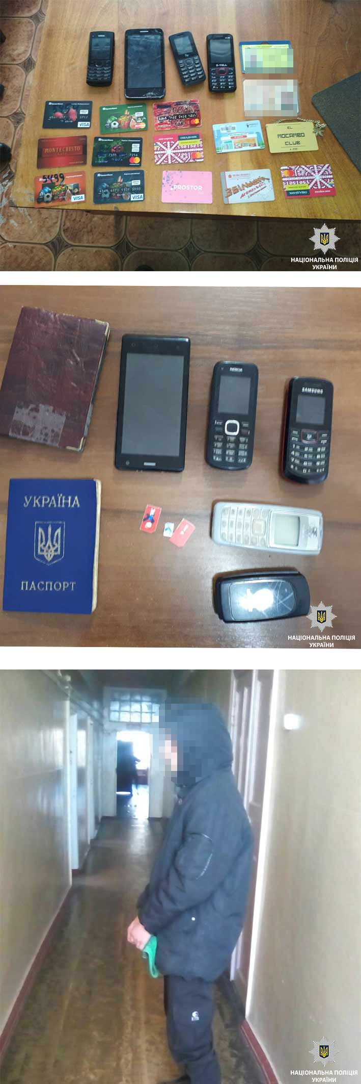 Поліцейські вилучили у зловмисника 6 мобільних телефонів, банківські картки та інші речі, які належали потерпілим.