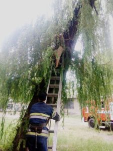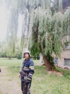 Рятувальники встановили, що на дереві, орієнтовно на висоті 9-ти метрів, знаходиться жіночка та кіт. Жінці допомогли спуститися за допомогою драбини, а кіт під час рятувальної операції втік на дах поруч розташованого будинку.До порятунку залучено 4 чоловіка особового складу та 1 одиниця пожежно-рятувальної техніки Головного управління ДСНС України у Дніпропетровській області.