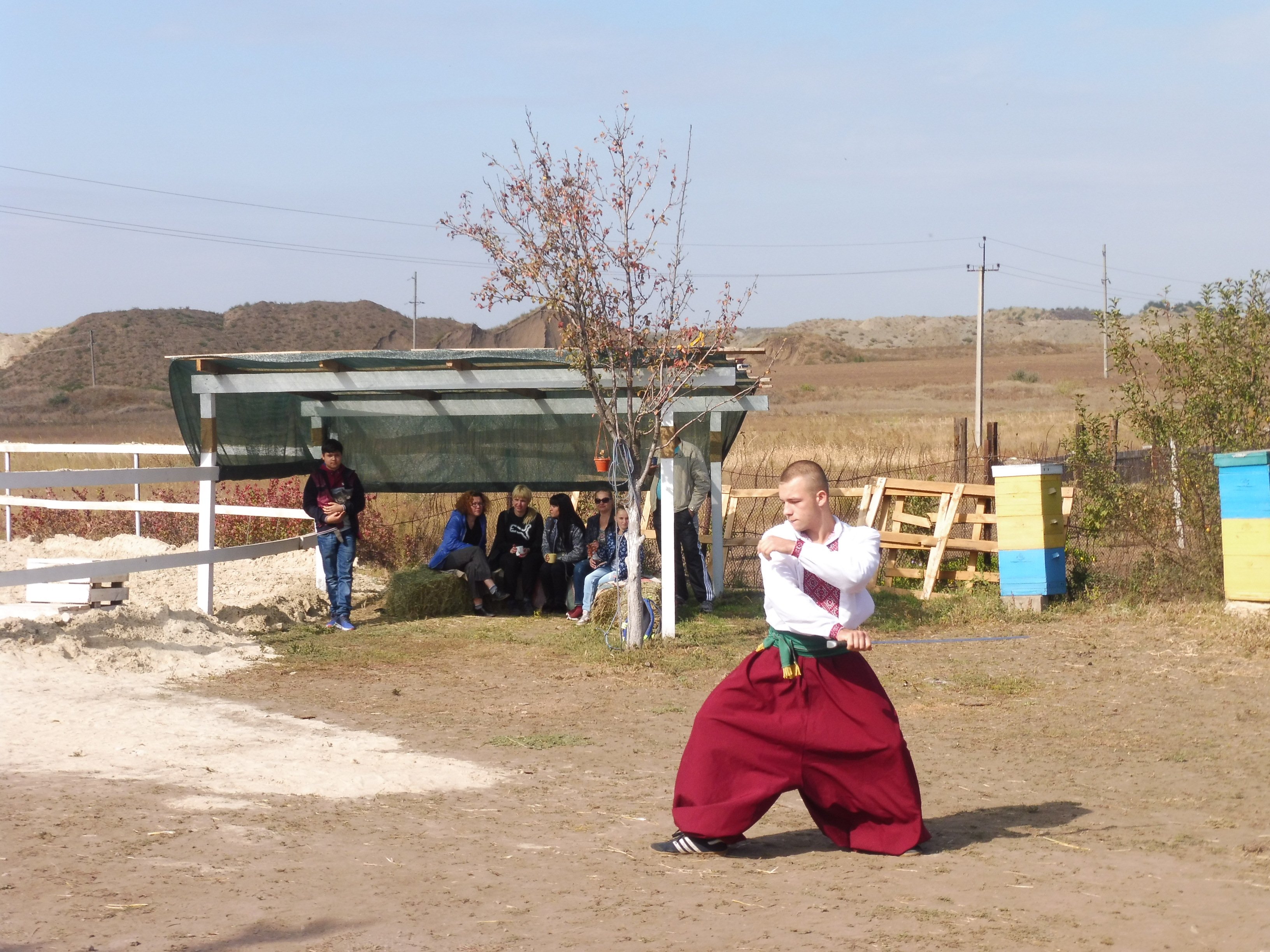 Господар також продемонстрував власну майстерність верхової їзди, розповів про її особливості та правила догляду за кіньми. Ще одним яскравим моментом став показовий виступ місцевих козаків з віртуозною технікою володіння холодною зброєю, у тому числі шашкою і серпами.