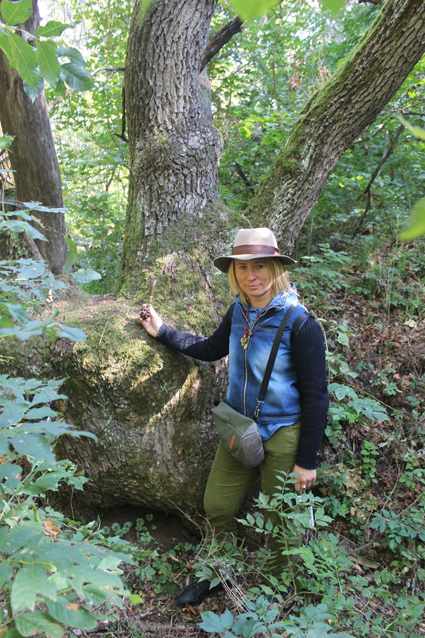 А тим часом йдемо вгору. Балка звивається вверх, перетинається валунами, місцями навіть доводиться долати справжню скелю. Імовірно, тут теж колись текла вода. Прямуємо довгою вузькою балкою, аж раптом перед нами величний дуб. Такий собі козарлюга, якого в обхваті й три людини не обіймуть. «Чи живий, козаче?» – питає, Валентина…