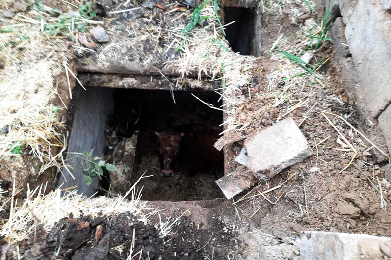 Прибувши до місця виклику, рятувальники та комунальники, за допомогою обладнання витягнули бичка з льоху та передали стурбованій власниці.