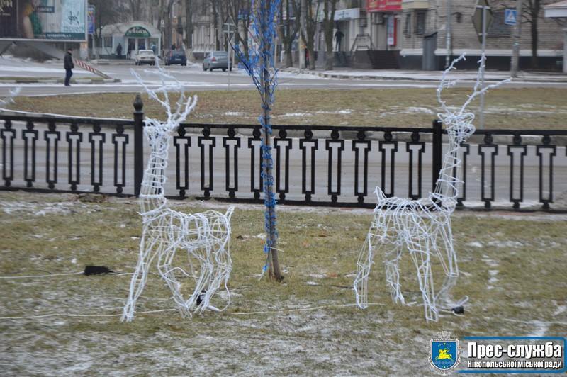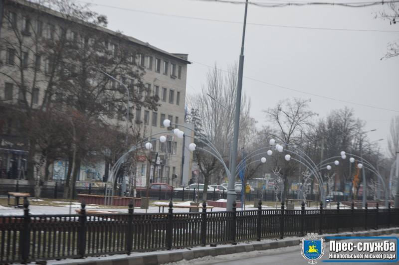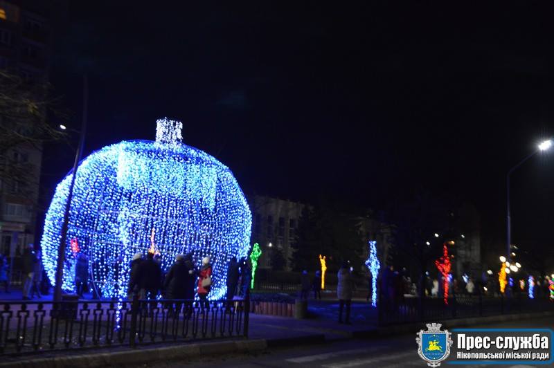 Величезна інсталяція – ялинкова прикраса куля, яка світиться тисячами вогників – це подарунок для мешканців міста. Простоїть прикраса до кінця новорічних свят. Дерева наразі теж прикрашені різнокольоровими гірляндами.