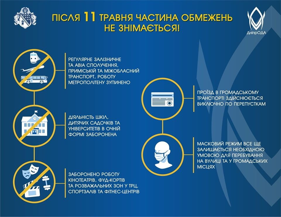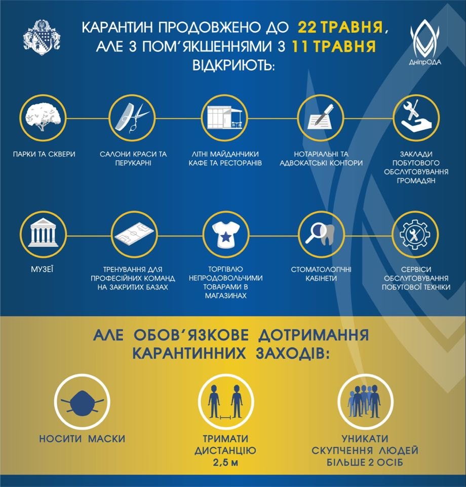 Зняли на Дніпропетровщині частину карантинних обмежень. Але режим надзвичайної ситуації та карантин не скасовано. Усі послаблення можливі виключно за умови дотримання суворих протиепідемічних та санітарних норм.