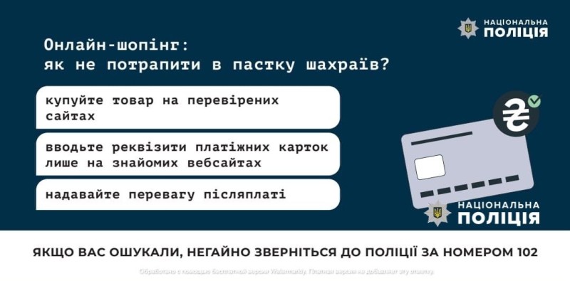 Поліцейські нагадують громадянам бути уважними та обережними під час купівлі товару в інтернеті. Уважно вивчайте оголошення, звертайте увагу на відгуки продавця. Не давайте шансів ошукати вас. Якщо ж все-таки стали жертвами шахрайських дій, звертайтеся до поліції.