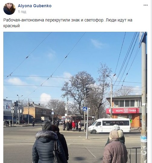 «Рабочая – Антоновича, перекрутили знак и светофор. Люди идут на красный», – пишет наблюдательная днепрянка Алена Губенко.
