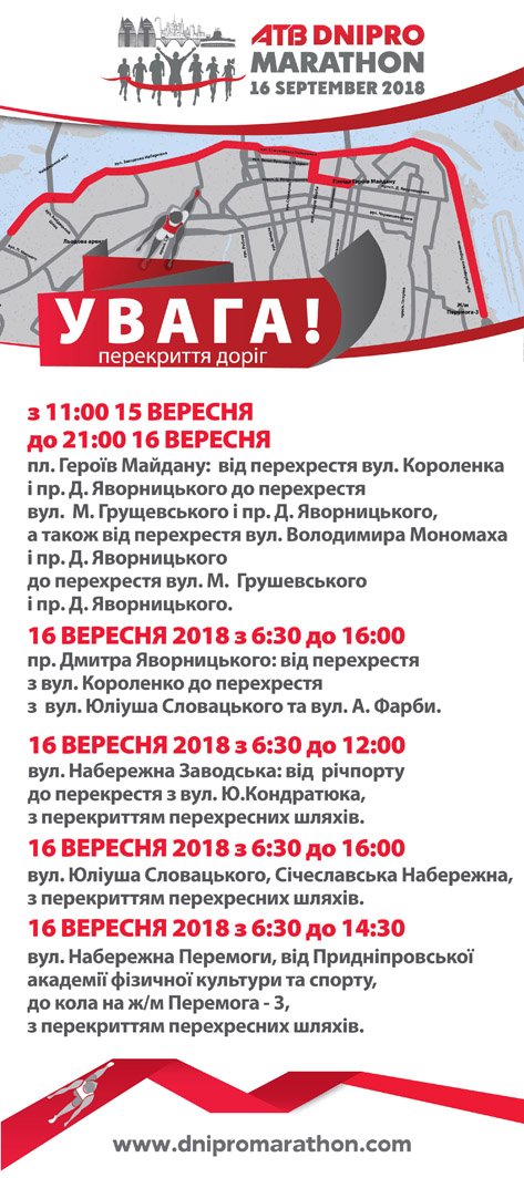 З 11:00 15 вересня до 21:00 16 вересня у зв’язку з проведенням ATB Dnipro Marathon буде перекрито рух транспорту від перехрестя вул. Короленка і просп. Дмитра Яворницького до перехрестя вул. Михайла Грушевського і просп. Дмитра Яворницького, а також від перехрестя вул. Володимира Мономаха і просп. Дмитра Яворницького до перехрестя вул. Михайла Грушевського і просп. Дмитра Яворницького. Про це повідомляють у прес-службі міської ради.