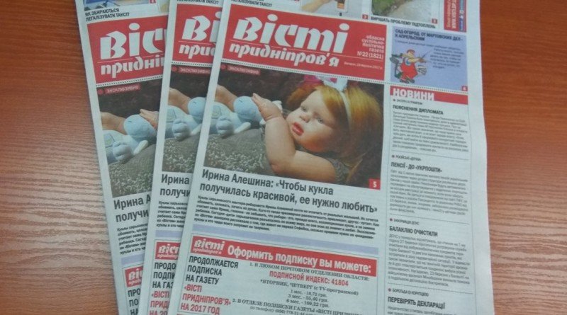 Или в отделе подписки «Вістей Придніпров’я» за телефоном (056) 778-21-44 или по электронной почте t.ovchatova@gmail.com