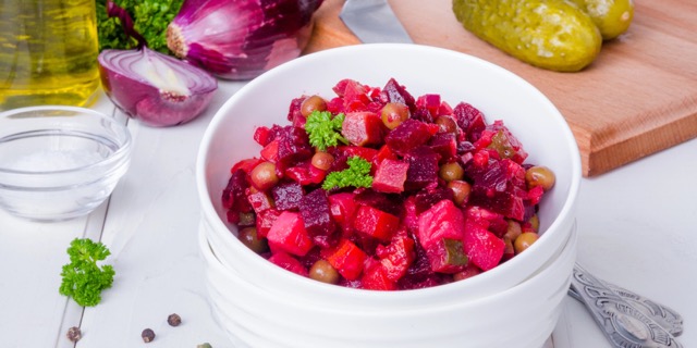 Вирішили відійти від класики — вінегрету з квасолею і вінегрету з квашеною капустою — і додати замість цих інгредієнтів оселедець. А це зробить салат кориснішим завдяки жирам у рибі.
