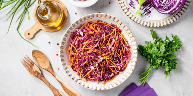 Цей яскравий салат із червоної капусти — ідеальне доповнення до осіннього столу, він поєднує свіжість овочів та пікантність маринованої цибулі.