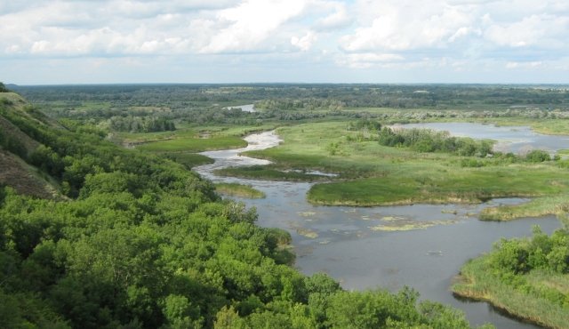 Взобравшись по крутому склону на вершину холма и увидев открывающуюся панораму, мы поняли: ехали не зря. Положив велосипеды в стороне, расположились любоваться уникальным видом на плавни. В результате длительного затопления поймы река разбилась на несколько русел, образовались островки причудливой формы, покрытые зарослями камыша, разнотравьями и деревьями.