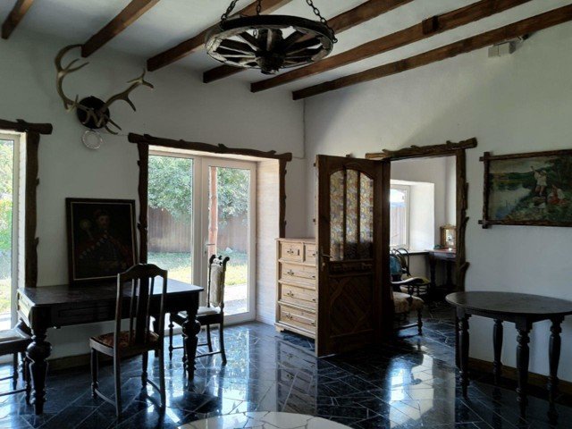 Чтобы воссоздать дух ушедшей эпохи, Вячеслав скупал на барахолках старинные картины, столы, стулья, двери и даже ручки к ним. Например, в гостиной висит несколько полотен, которые были написаны в начале прошлого века, а под потолком в качестве люстры красуется старое колесо от повозки.