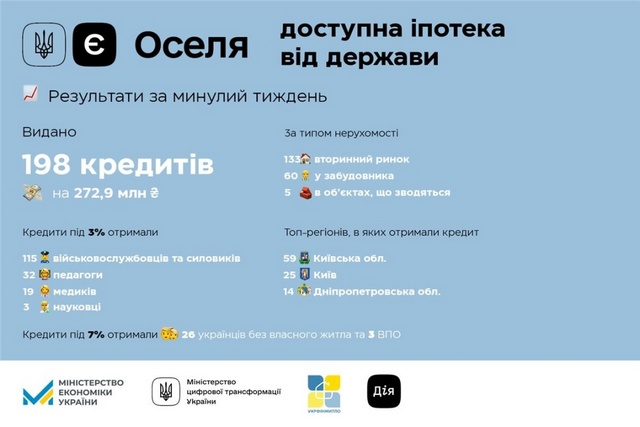 Зокрема, минулого тижня українці отримали за програмою “єОселя” 198 кредитів, серед яких: кредити під 3% отримали 115 військовослужбовців та силовиків, 32 педагоги, 19 медиків та 3 науковці, а кредити під 7% отримали 26 українців без власного житла та 3 внутрішньо переміщені особи.