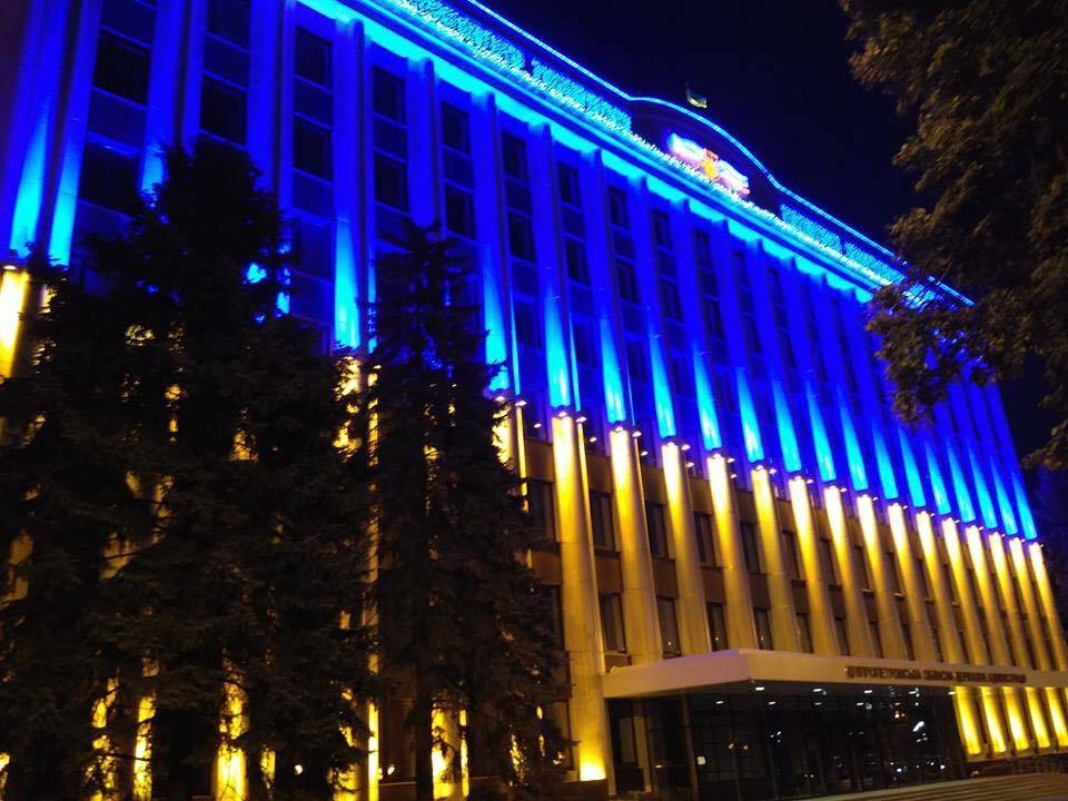 До Дня Державного Прапору України та 25-ї річниці Незалежності України на головній будівлі Дніпропетровщини засяє 2328 вогнями жовто-блакитний прапор розміром 61 м х 29 м. Саме такий габарит у 7-ми поверхового фасаду будівлі Дніпропетровської облдержадміністрації, що на проспекті Олександра Поля, 1 у Дніпрі.