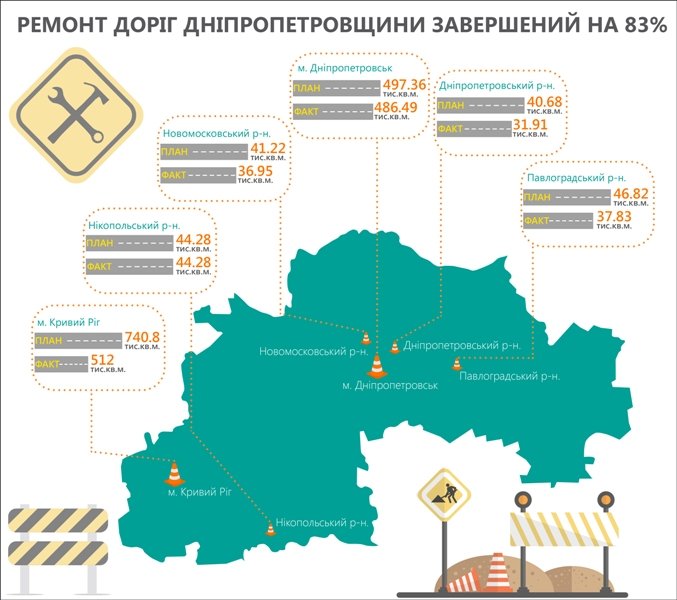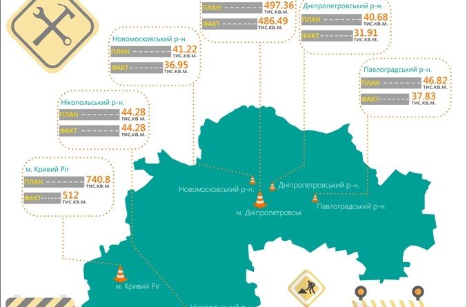 На Дніпропетровщині запланувало до листопада цього року відремонтувати більше 2 мільйонів квадратних метрів доріг по всій області. Це найбільший обсяг за останні роки. У Нікопольському районі, наприклад, вже виконали план на всі «сто», відремонтувавши 44 тисячі квадратних метрів. У Дніпропетровську із запланованих 497 тисяч квадратів завершені більш 486 тисяч. У Кривому Розі – з 740 тисяч готові 512 тисяч.