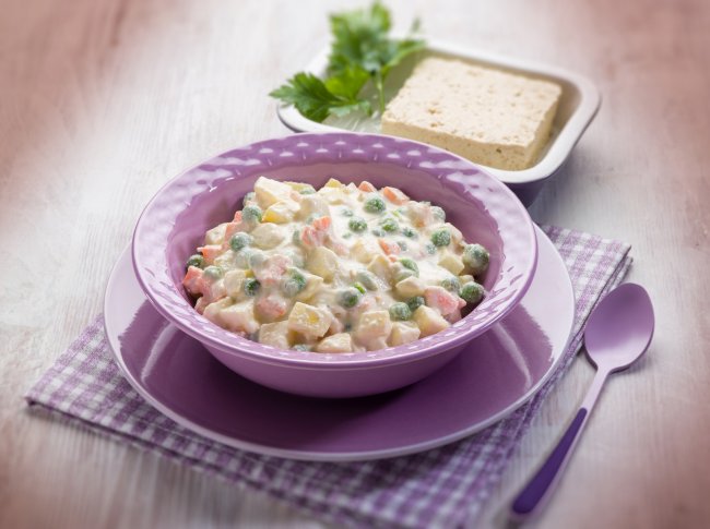 Способ приготовления: Картофель, морковь, яйца, лук и огурец измельчить, смешать с горошком, заправить стаканом нежирной сметаны. Незадолго до подачи на стол добавить немного зелени и сухарики.
