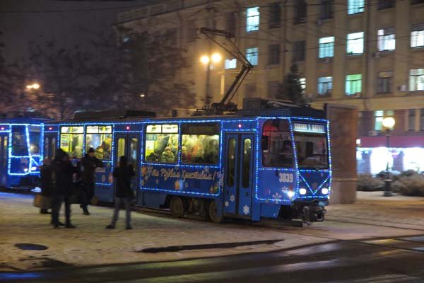 Речь идет про новогодний трамвай, украшенный светодиодными гирляндами, который курсирует по маршруту № 1 «Железнодорожный вокзал – Транспортный университет».