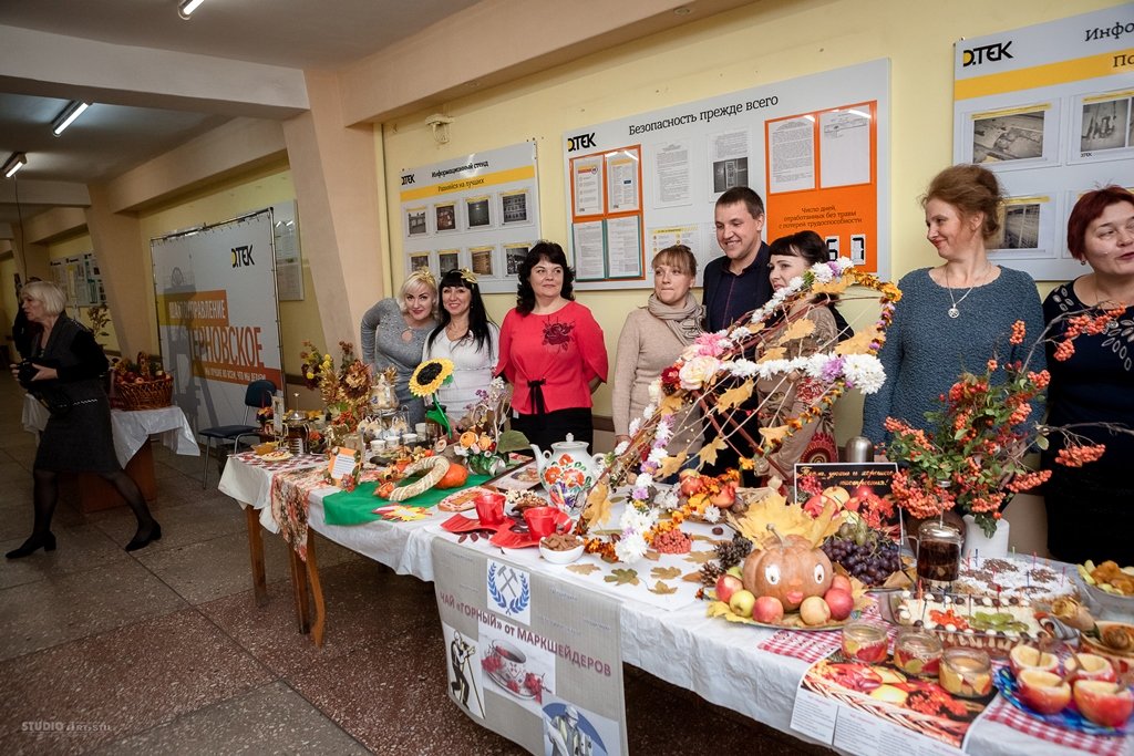 Вкусный праздник для всех. Шахтеров перед второй сменой поили горячим чаем, а самовар, который едва поместился в двери автобуса, стал просто героем праздника. А еще – раздавали рецепты фирменного напитка. Какой вкуснее и кому достанется трофейный торт, – жюри решало долго. Под песни об осени, – они звучали в этот день в холле, все вместе пили чай. Тут же столы пестрили композициями на осеннюю тематику.