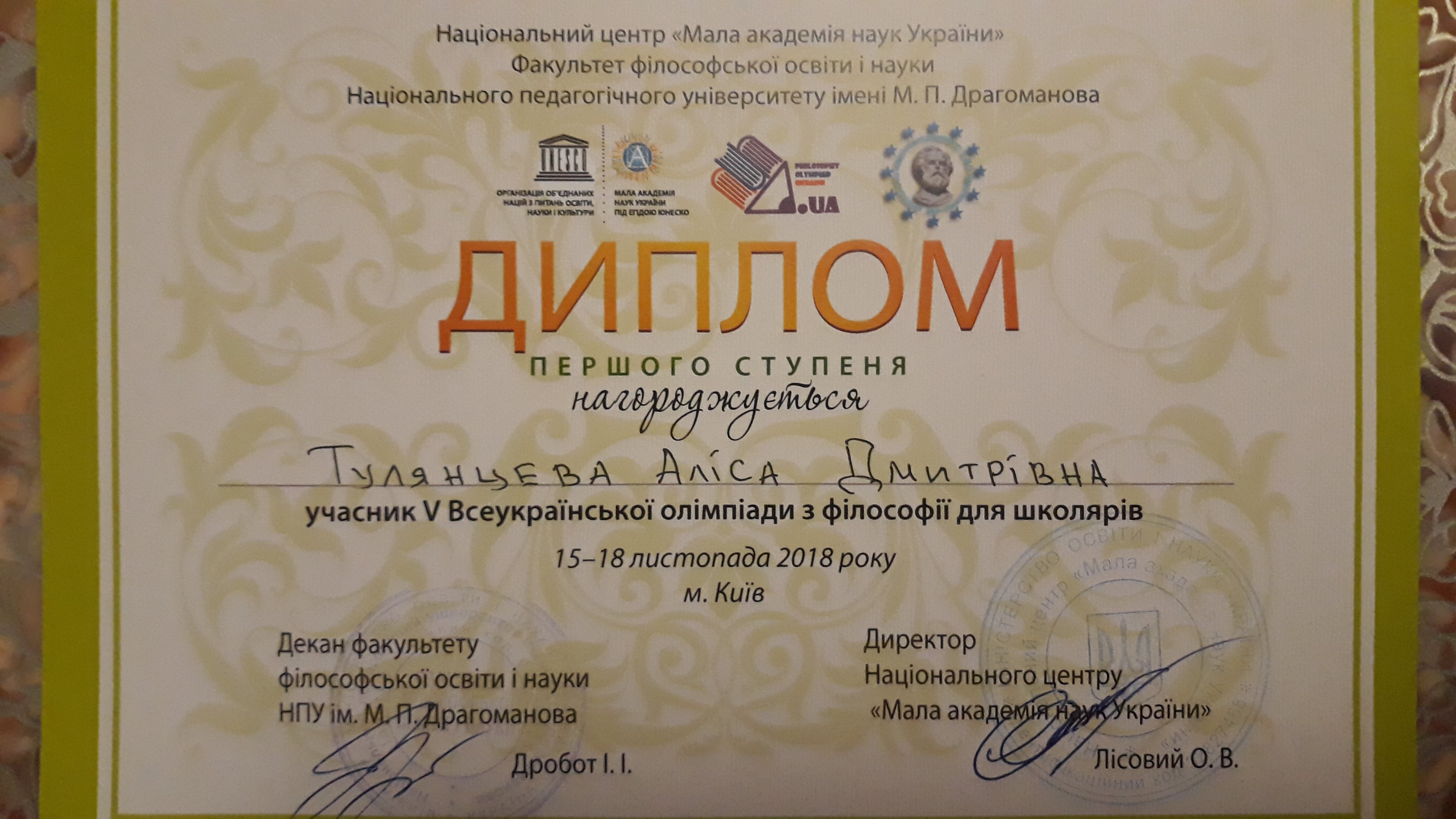 «У Всеукраїнській олімпіаді з філософії беремо участь щороку. У 2018-му свої сили спробували п’ятеро наших вихованців. Троє – здобули призові місця, – розповіла директор Малої академії наук у Дніпрі Наталя Тягло. – Аліса не лише зайняла перше місце – вона отримала право представляти область на міжнародній олімпіаді з філософії в Римі».
