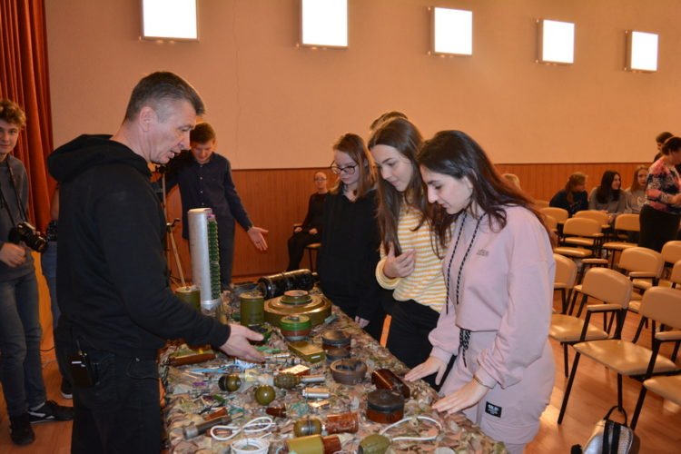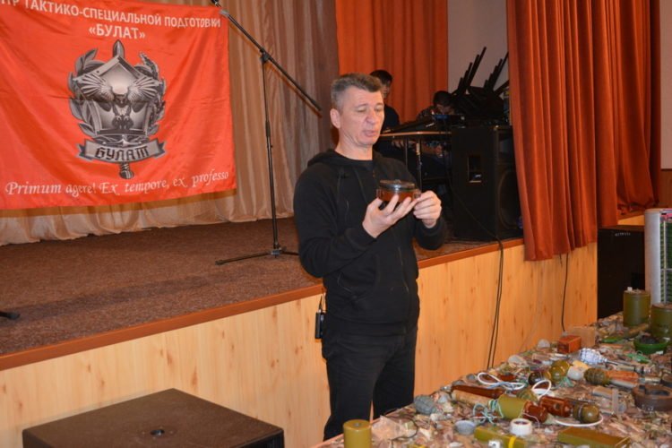 Наочно Сергій Рєзанов та тренер із самозахисту Павло Шеляг познайомили дітей та дорослих (до заняття також долучились команда місцевих пожежних та стажери – поліцейські офіцери громади) з різновидами вибухових пристроїв, всі вони розроблені ще в радянські часи, активно використовувались під час війни в Афганістані, зараз сіють смерть на сході нашої країни. Багато з вибухових пристроїв зовсім не схожі на зброю. Деякі скоріше на шкатулки, футляри для окулярів, а інші – на іграшки, назви навіть у них невоєнні – «пелюстки» – п’ятикольорові невеличкі, схожі на пелюстки квітів, предмети, їх не відразу можна вирізнити, тож дуже важливо бути обережними!