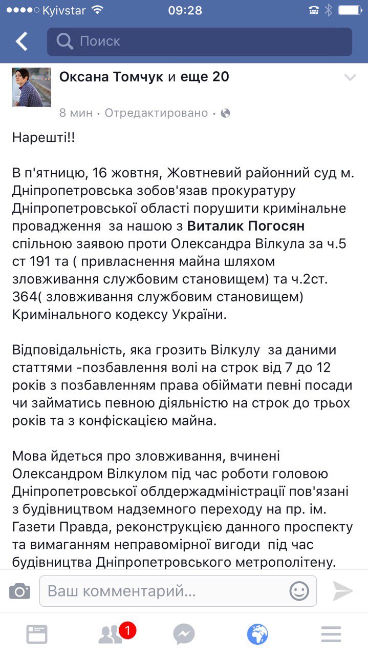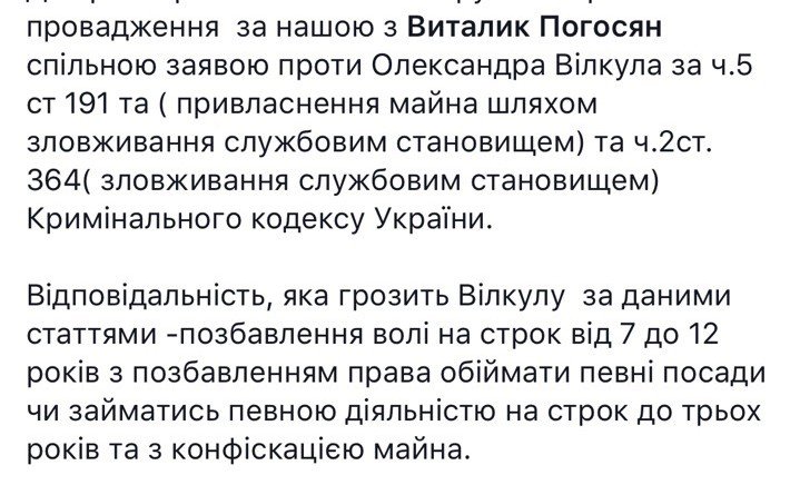 Жовтневый районный суд города Днепропетровска обязал прокуратуру Днепропетровской области открыть уголовное дело против лидера «Оппозиционного блока» Александра Вилкула по ч. 5 ст. 191 (присвоение имущества путем злоупотребления служебным положением) и ч. 2 ст. 364 (злоупотребление служебным положением) криминального кодекса Украины.