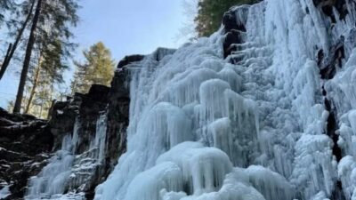 В Івано-Франківській області через стійкі морози замерз Манявський водоспад — один із найбільших і найвідоміших водоспадів України. Фото та відео крижаного водоспаду активно поширюють у соціальних мережах.