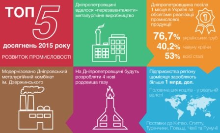 Дніпропетровщина посіла 1 місце в Україні за обсягами реалізації промислової продукції. 20% всіх коштів від продажу промислової продукції України заробили підприємства Дніпропетровщини. За 11 місяців 2015 року – 264 млрд. грн., що майже на 50 млрд. грн. більше, ніж минулоріч. Дніпропетровська область цьогоріч виготовила 76,7% українських труб, 40,2% чавуну країни та майже 53% всієї сталі.