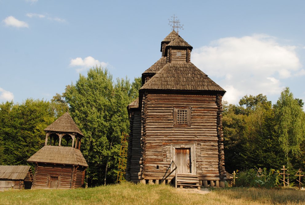 Розпочинаємо подорож з огляду експозиції старовинної Наддніпрянщини: її величних козацьких церков, білених хаток під солом’яними стріхами, що замріяно дивляться в небесну блакить невеличкими вікнами, ховаючись за тиночками та кущами калини. За бажанням, можна зайти до будь-якого будиночка, оглянути його. Відчиняємо двері в той, що найбільше нагадує хатину Солохи. Прохолодно, пахне травами, на стінах – образи в рушниках. Стоять тесані лави, на покуті – стіл, накритий скатертиною, з хлібом-сіллю на рушнику, біля стола – скриня. На дворі, поруч із головною будівлею, – численні господарські споруди: хліви, повітки, клуні, комори, в яких наші пращури зберігали харчові продукти, знаряддя праці, родинне майно.