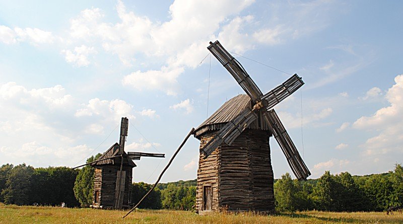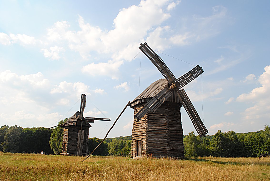 Неподалік, на лузі, височать кілька десятків вітряків. Вони, мов зачаровані велетні, стоять нерухомо, здивовано дивляться в небо. На моє запитання працівникові музею: «Чому млини не крутяться?» – отримую сумну відповідь: «Грошей у держави на ремонт немає… Ось і гине унікальна спадщина». Отакої! Який жаль…Бо ж колись в Україні вітряки були не рідкістю, а обов’язковою частиною колориту українських сіл, охоронцями степових доріг. Біля них подорожні відпочивали, визначали дорогу.