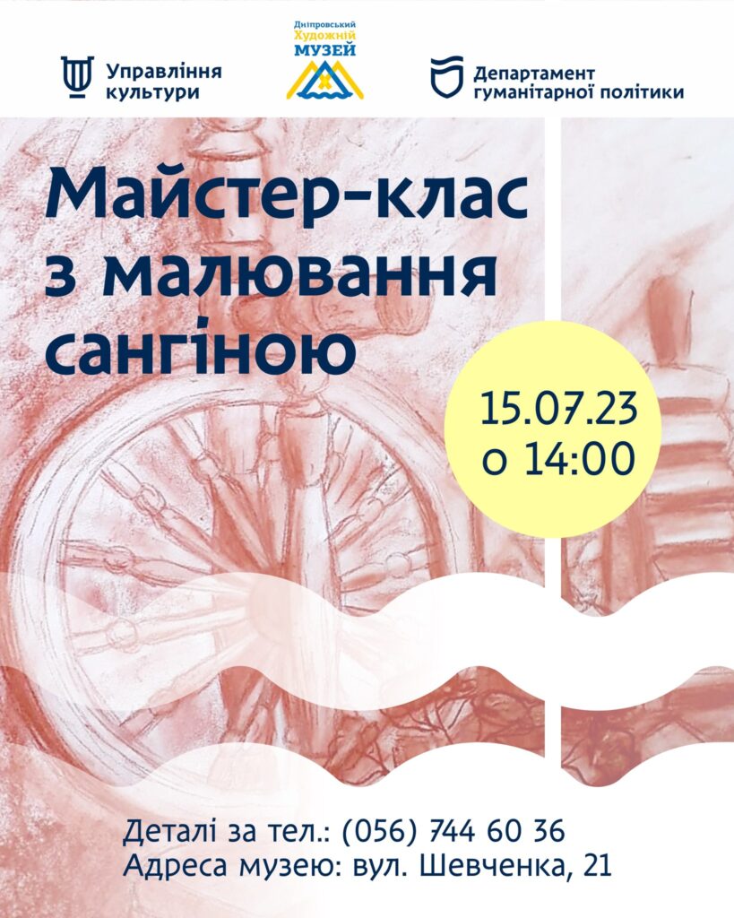 Дніпровський художній музей повідомляє, що на вихідних – 15 липня о 14:00 відбудеться майстер-клас з малювання сангіною. «Ви відчуєте, наскільки цікаво працювати цим колоритним матеріалом, і створите міський пейзаж з відомою у Дніпрі архітектурною пам’яткою – будинком Хрінникова.  Долучитися можуть і дорослі, і діти. Чекаємо на всіх охочих!», – йдеться у повідомленні.